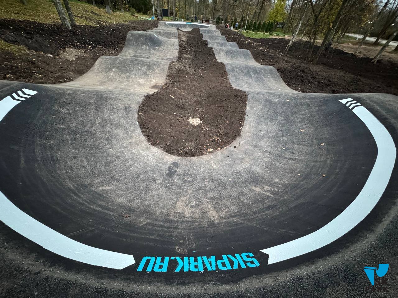 Памп трек предназначен как для любителей, так и профессиональных райдеров. Конструктивное решение предполагает размещение асфальтового покрытия на земляных откосах, с двумя отдельными входными группами. Общая протяженность трассы составляет 70 метров.