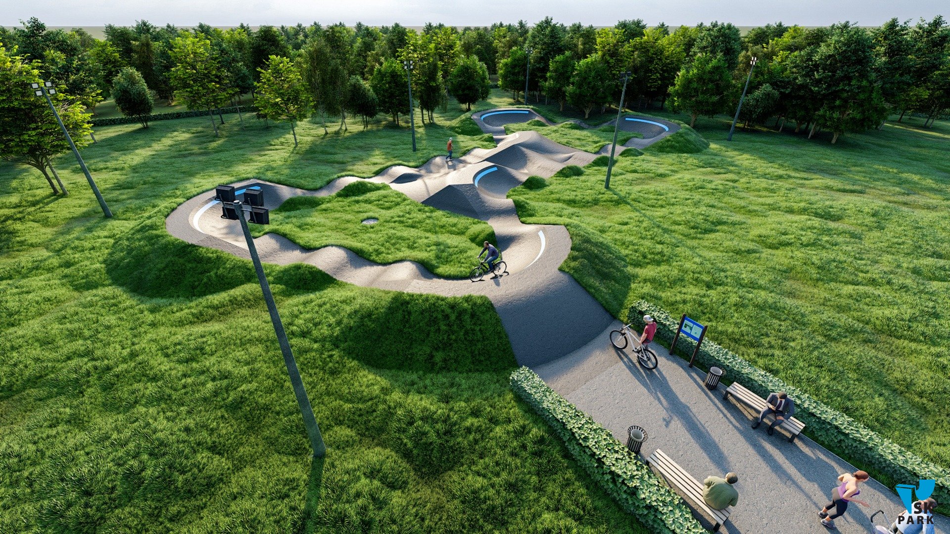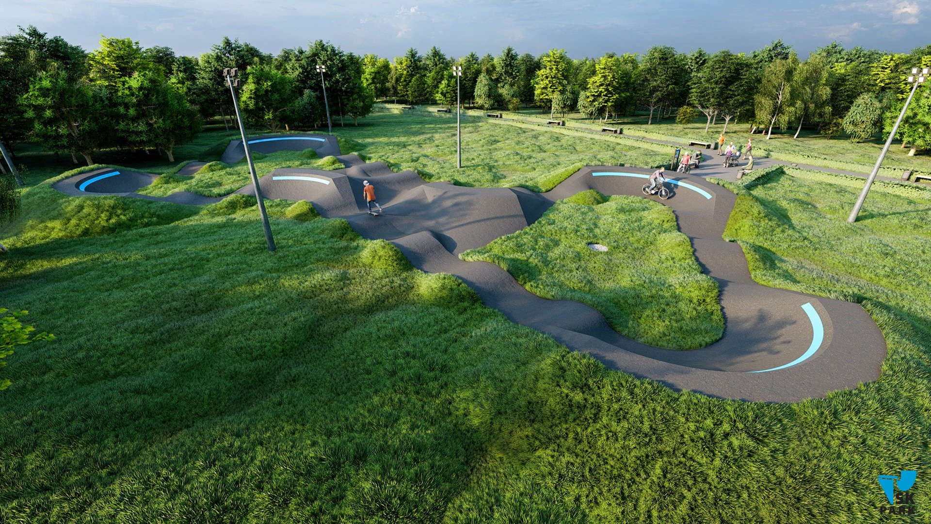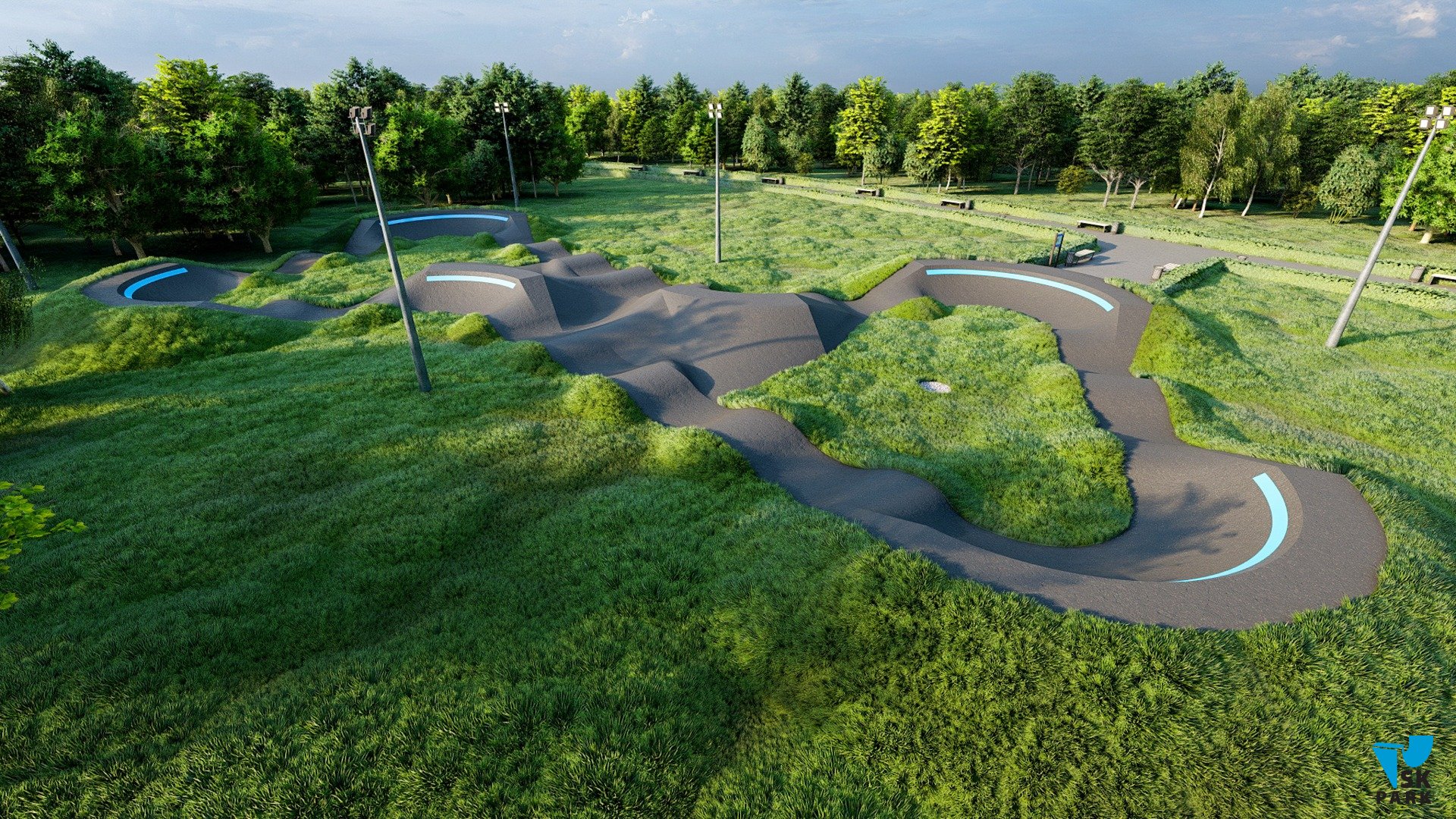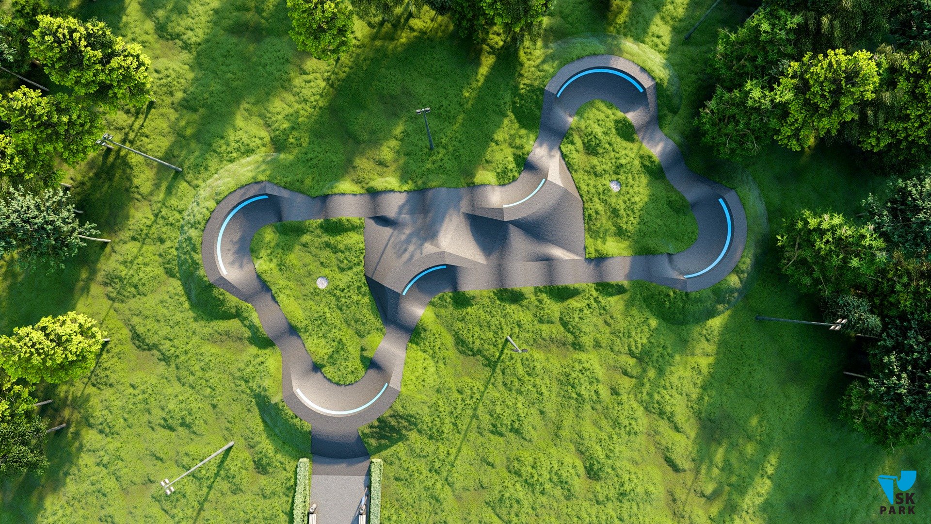 Профессиональный асфальтовый памптрек для катания на BMX и MTB , для райдеров с начальным, средним и профессиональным уровнем катания. Подходит для любого уровня райдеров, а также для тренировки спортсменов в олимпийской дисциплине «BMX race». Памптрек предусматривает 4 поворота на 120 градусов и 2 поворота на 60 градусов. Трасса позволяет проводить соревнования и показательные выступления в олимпийской дисциплине «BMX RACE». Асфальтовый памп трек, также позволяет кататься в дисциплинах скейтбординг, ролики, кик скутер