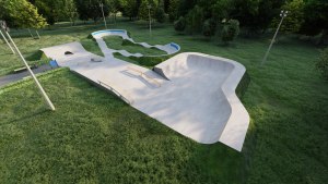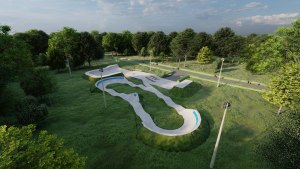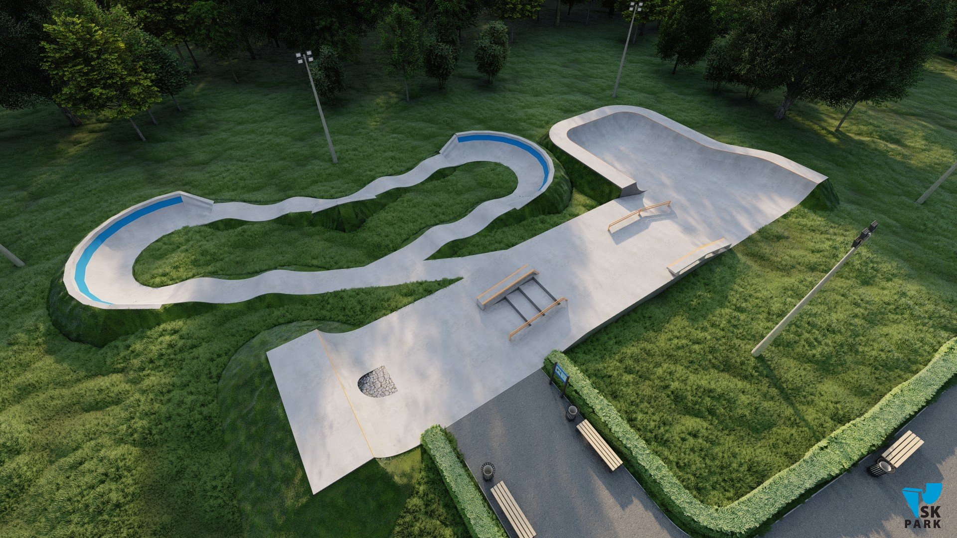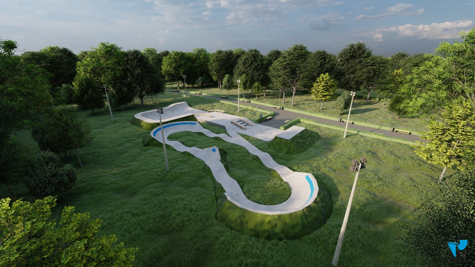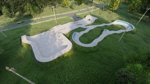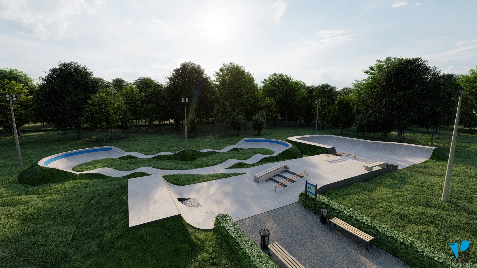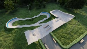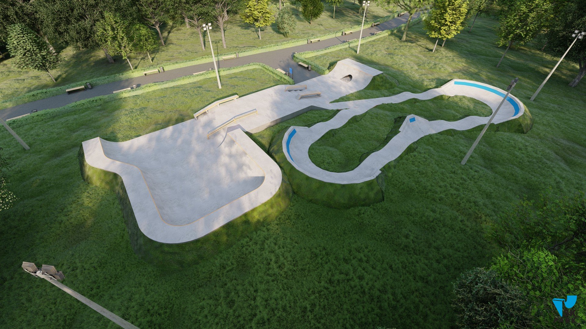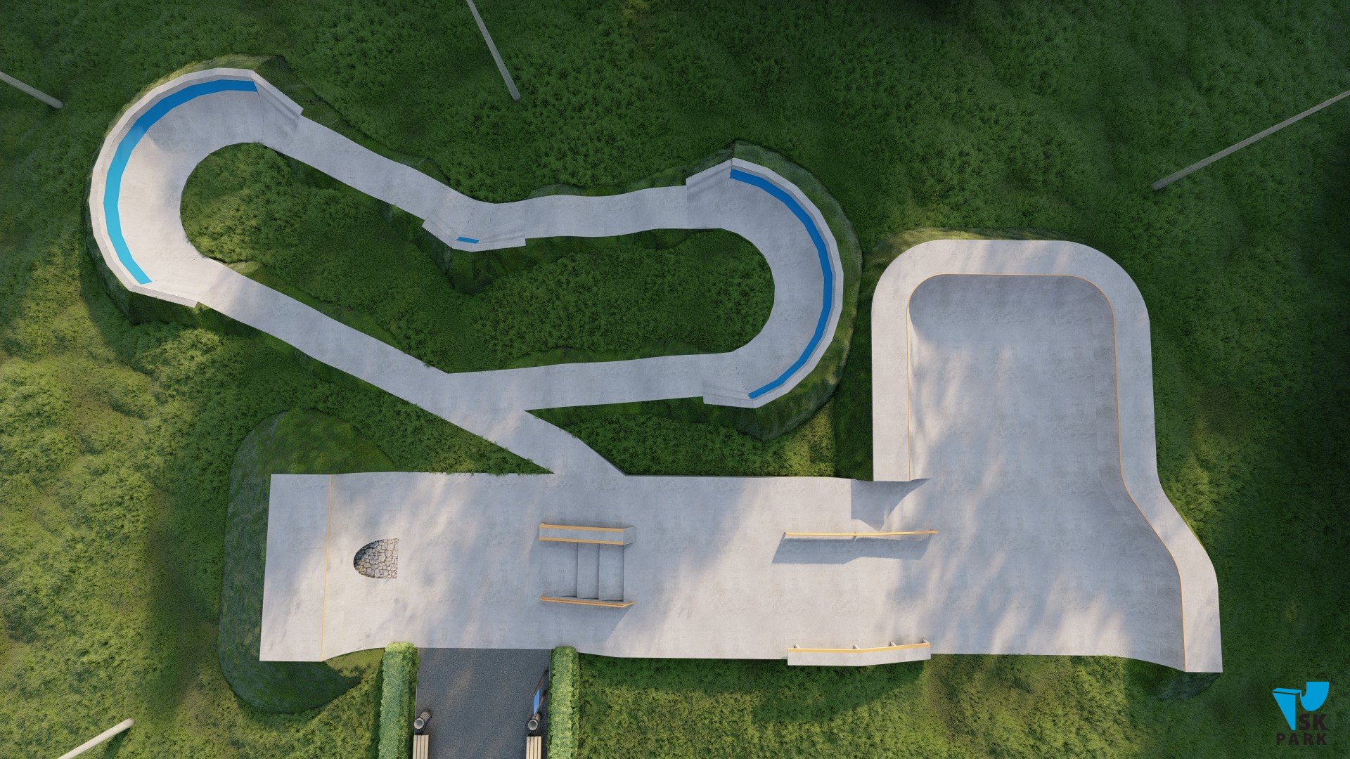 Для тренировок вкатывания в горки, повороты и кочки, в проекте предусмотрен бетонный памптрек, соединенный со скейтплазой, длинною 44 метра с тремя поворотами под разными углами. Памптрек является прекрасным тренажером для райдеров всех дисциплин.