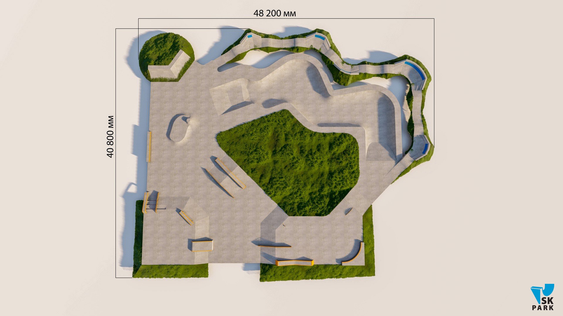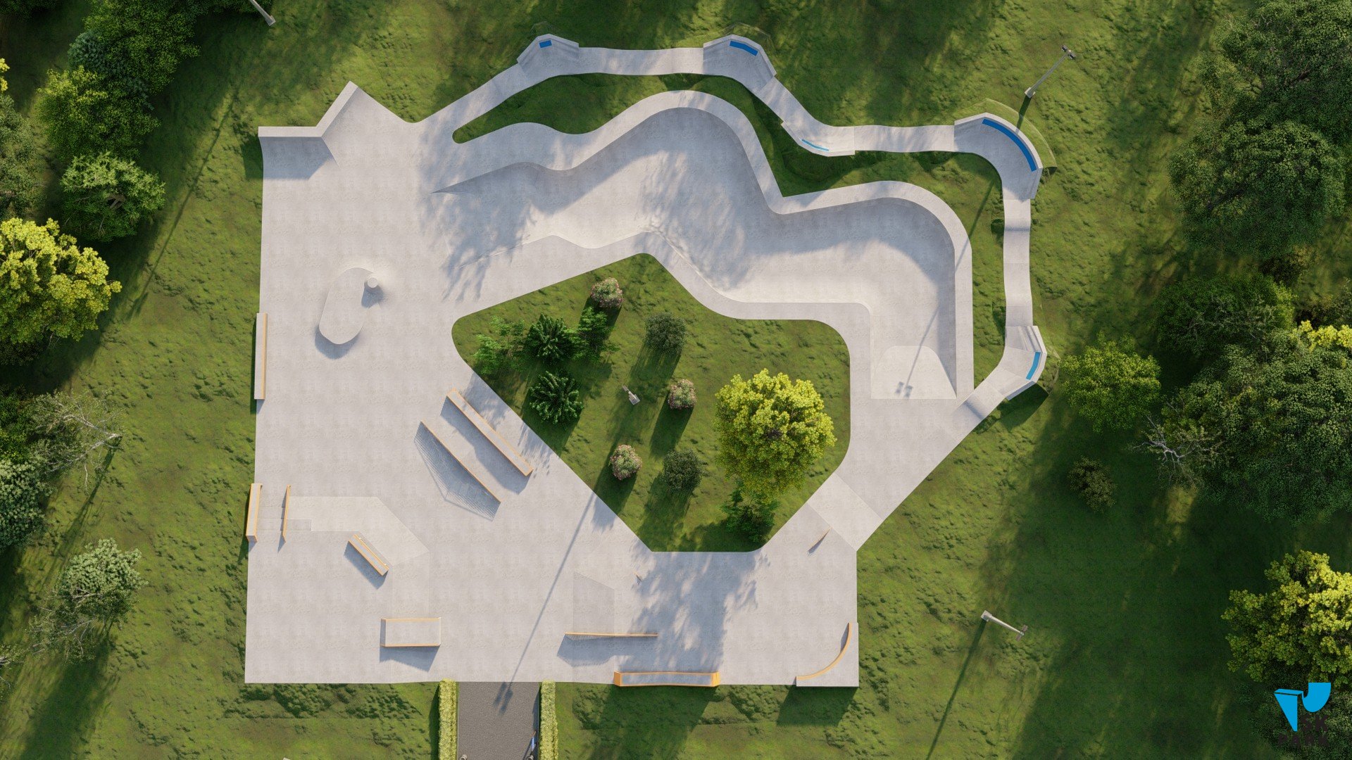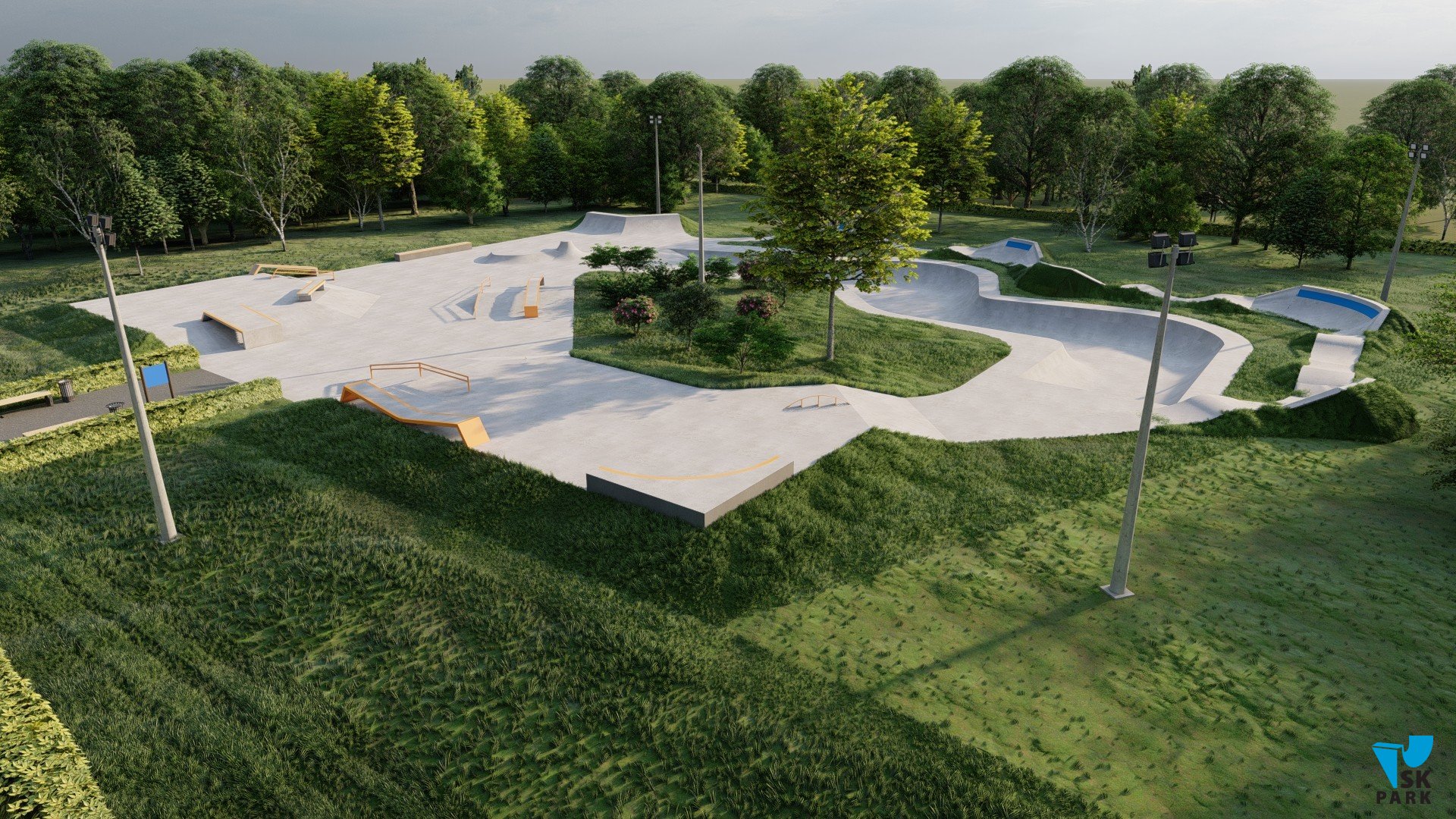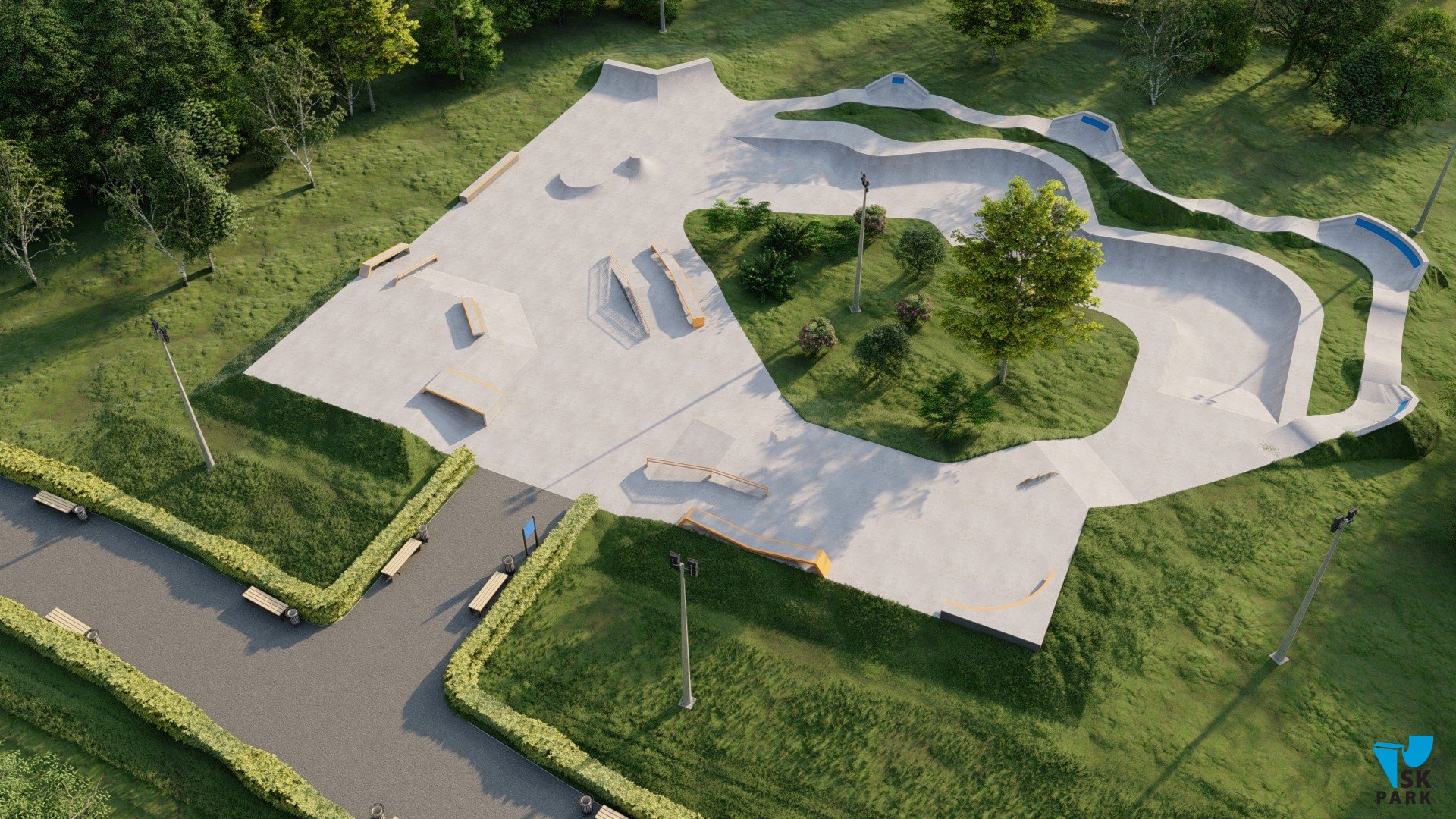 Скейт площадка спроектирована таким образом, что райдеры могут выполнять трюки, двигаясь по скейтпарку по кругу без остановки и отталкиваний, что соответствует самым современным трендам катания в скейт парках. Разнообразие фигур подходит практически для всех видов трюков. В проекте предусмотрен изогнутый разноуровневый боул, в котором могут тренироваться как дети, так и профессиональные райдеры. Две скейт плазы с пирамидами, перилами и гранями связаны между собой и ориентированы на тренировку навыков катания во всех заявленных дисциплинах. Высоты перил и граней подходят райдерам всех дисциплин(скейтбординг, ролики, кик скутер) и возрастов.