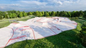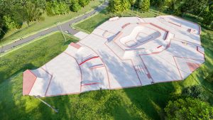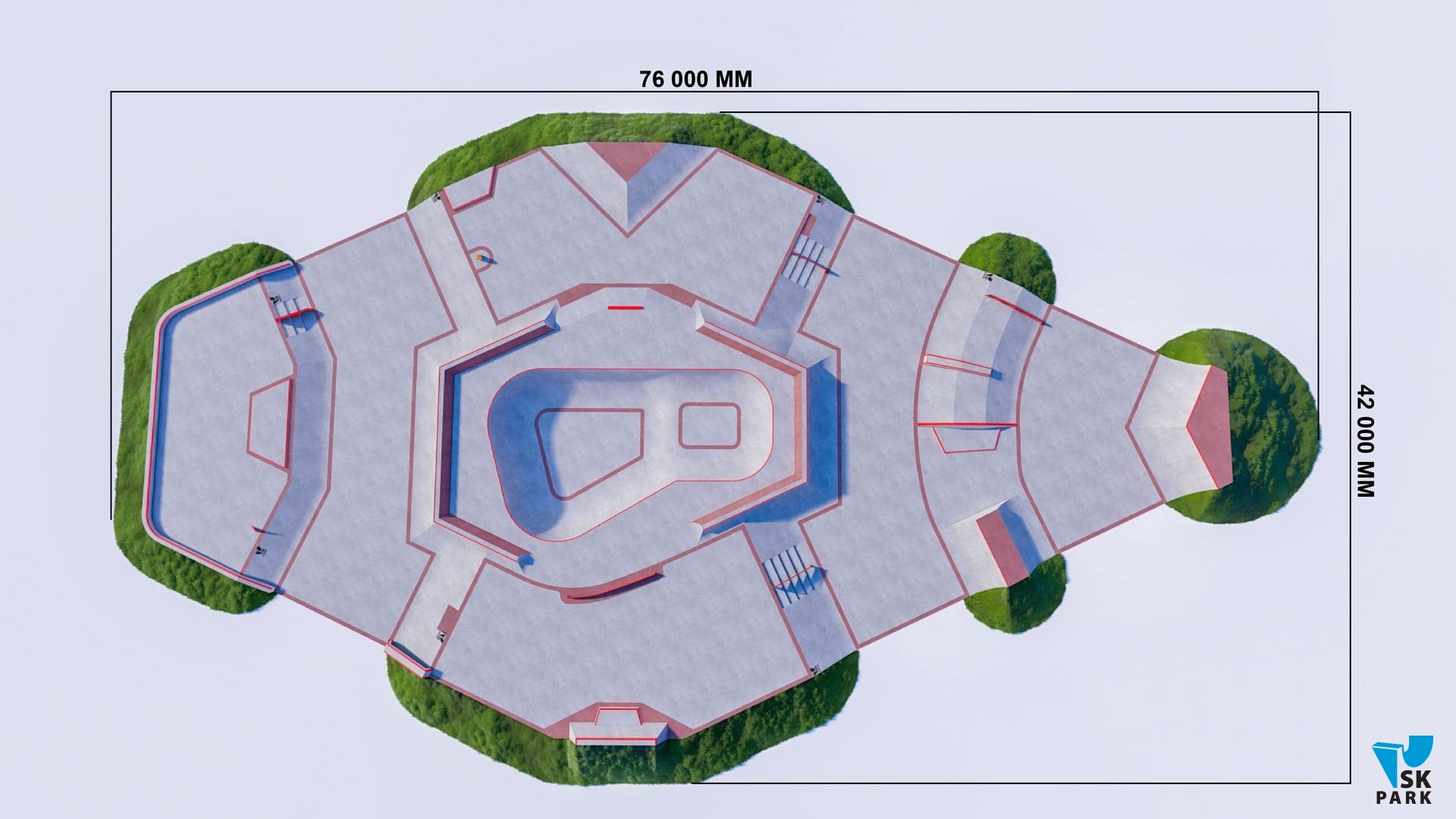 Скейт площадка спроектирована таким образом, что райдеры могут выполнять трюки, двигаясь по скейтпарку по кругу без остановки и отталкиваний, что соответствует самым современным трендам катания в скейт парках.