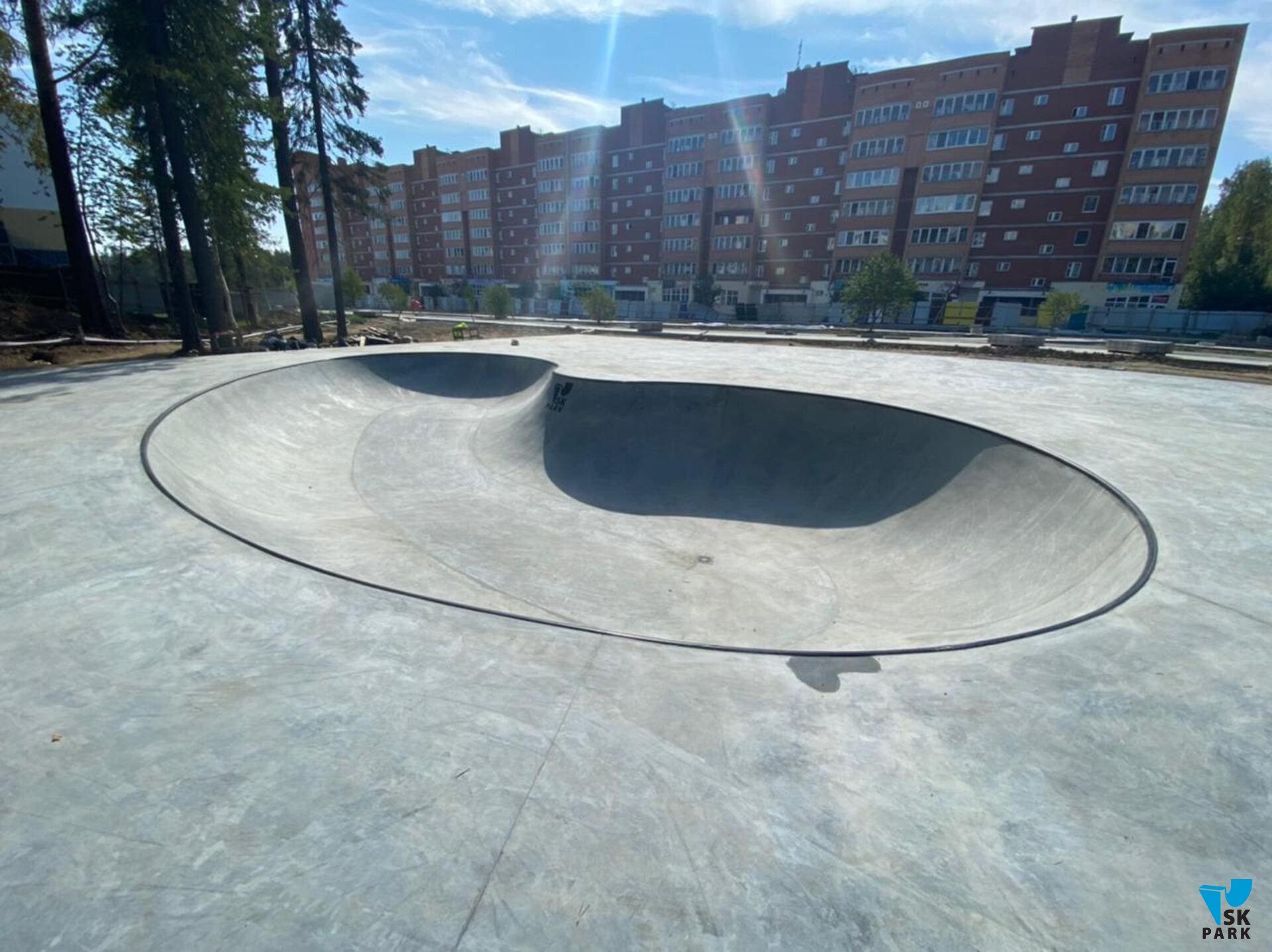 Затирка радиусов — это важный этап. Данная работа выполняется вручную до максимально ровного и гладкого состояния, что повышает безопасность при эксплуатации. После завершения строительства боула, по периметру всего скейт парка (300 кв.м.) была залита бетонная плита толщиной 150мм. Нарезка деформационных швов осуществляется что бы избежать трещин на монолитной поверхности, для всех бетонных работ мы используем бетон повышенной прочности класса Б35. Дренаж был выведен в колодец, который выполнялся заказчиком самостоятельно.