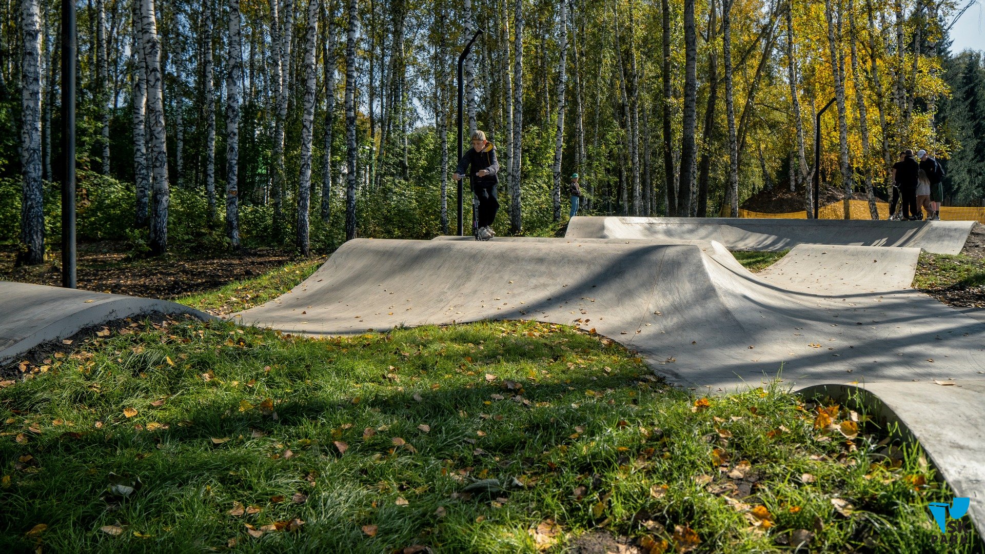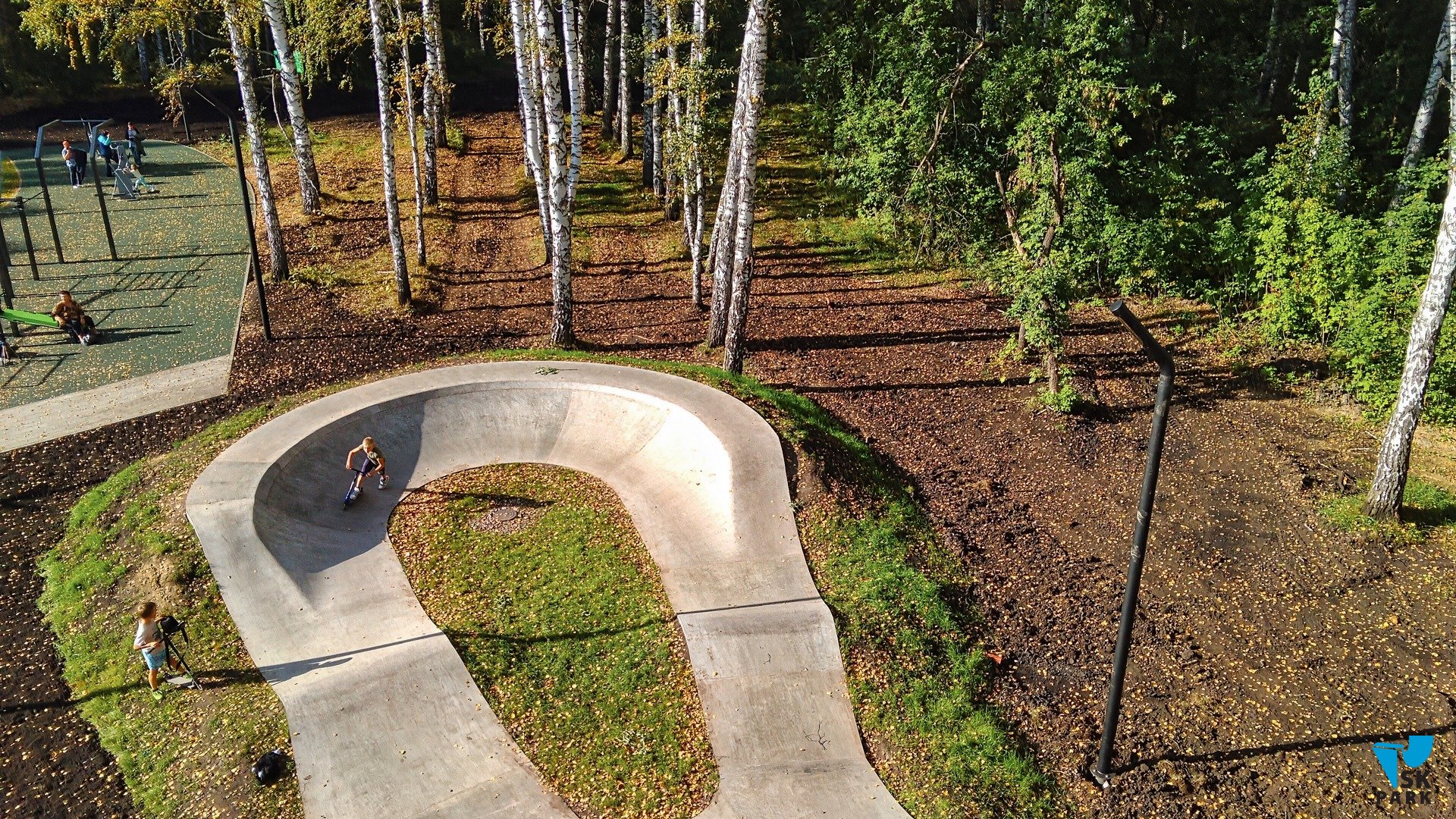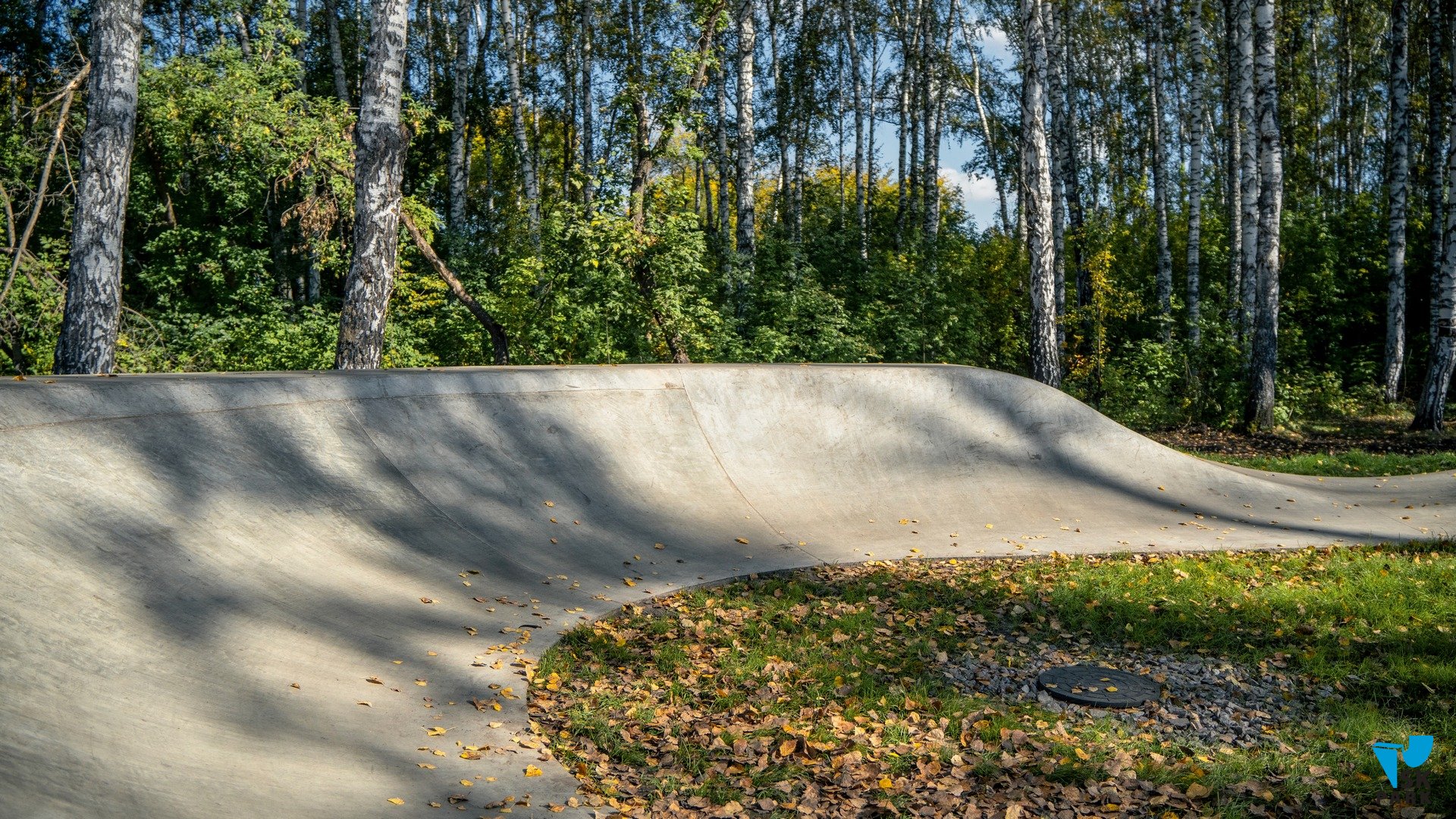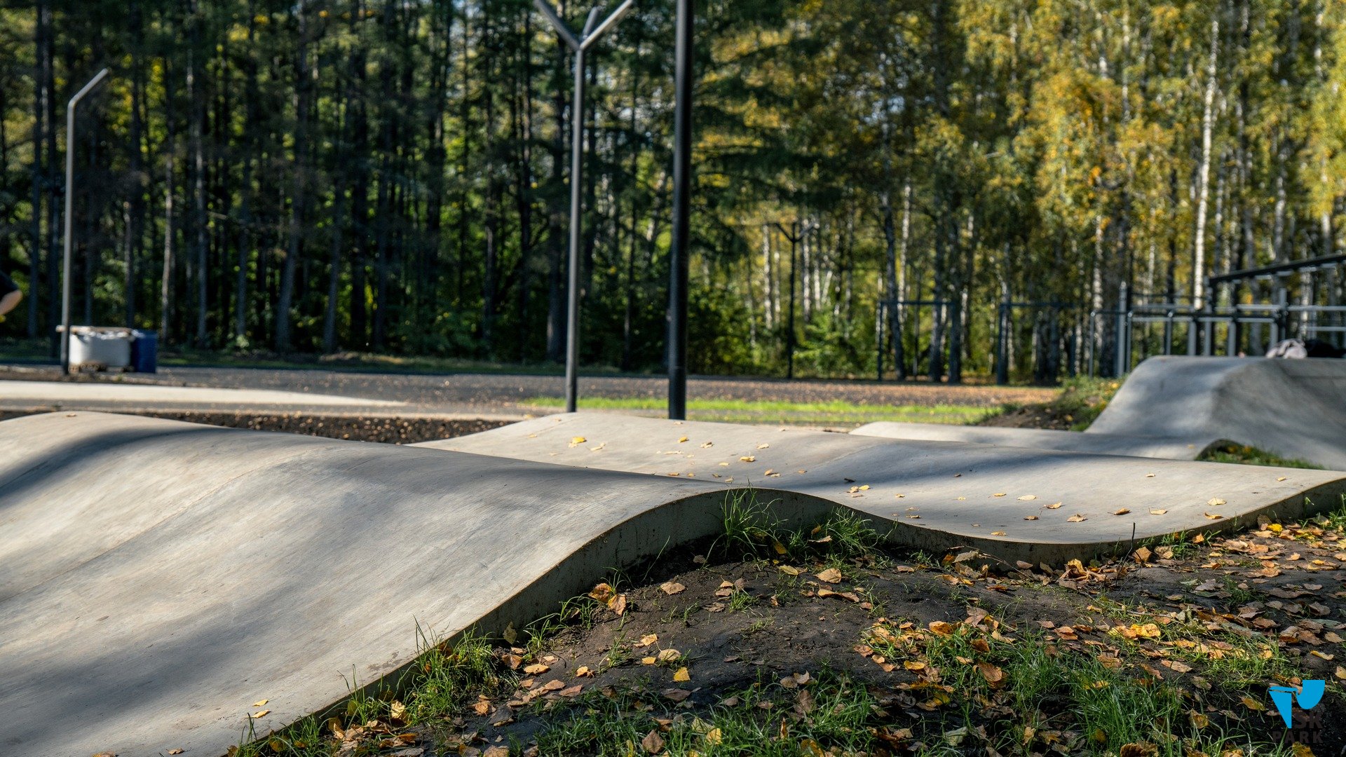 Общая площадь функционального покрытия из высокопрочного бетона составляет 152 кв.м. Можно отметить, что эта площадка больше подходит под категорию небольшого бетонного скейт парка, выполненного в виде памп трека. Опытные райдеры заметят это отличие в расположении ролла на входе в поворот: такая особенность позволяет комфортно использовать радиус поворота для скольжений по кромке, выполненной в стиле "ноупинг"- сленговое название квотер пайпа без коупинга. Отсутствие коупинга обусловлено тем, что это все-таки памп трек, а не полноценный бетонный скейт парк.