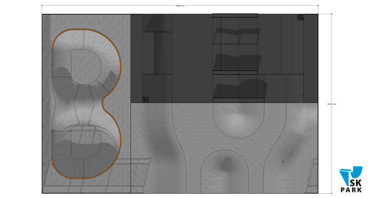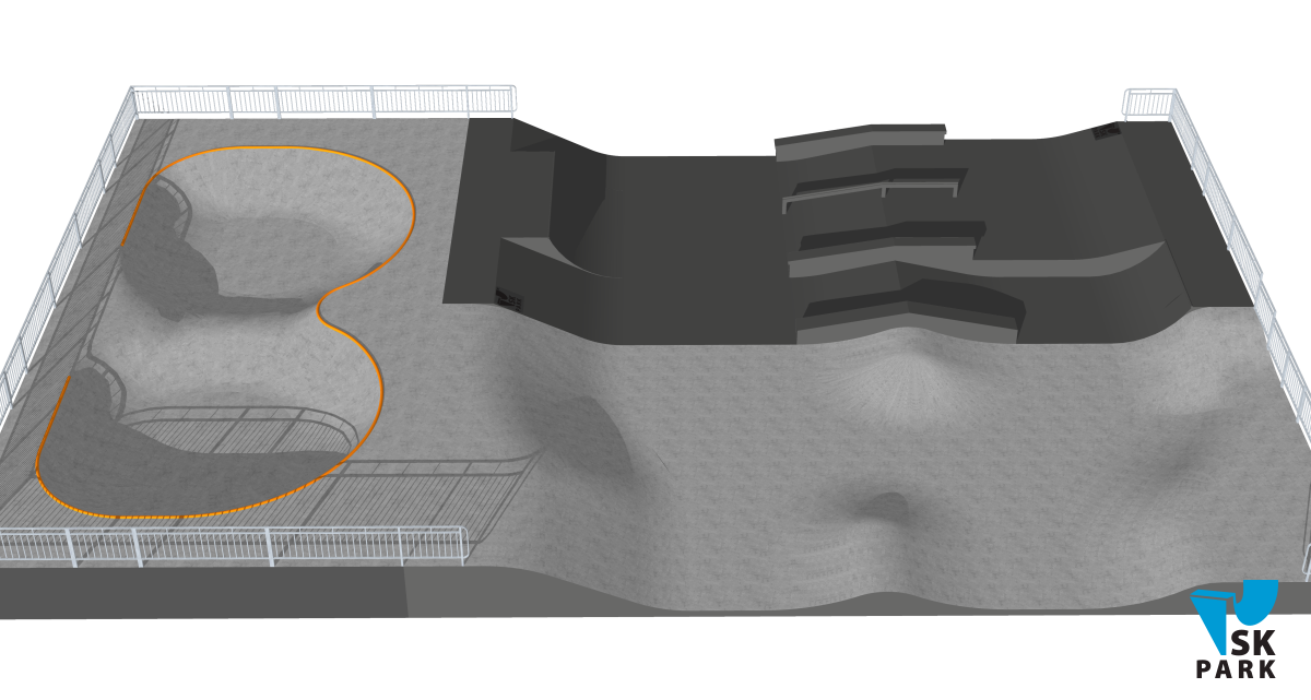 На эскизе проекта представлена часть скейт парка, которая была пристроена к существующей стрит зоне, что расширило площадь катания почти втрое.