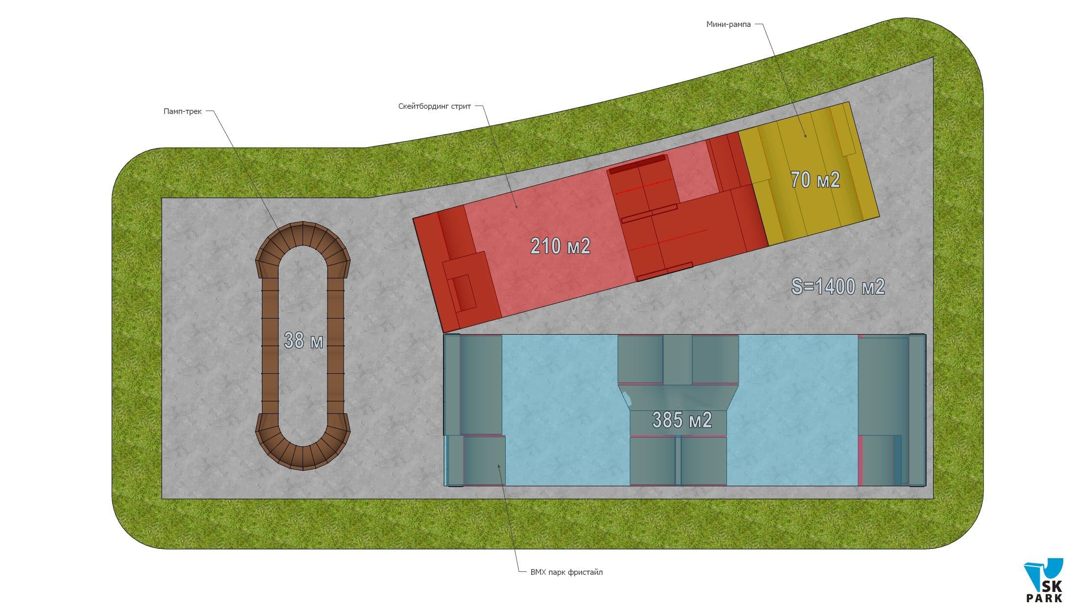 На площадке установлена ещё одна фигура – Памп-трек SKP 18-7 – типовое решение из каталога SK PARK. Данная модель отличается своей простотой, её длинна составляет 38 метров с двумя поворотами. Памп-трек создан для непрерывного катания (без кручения педалей или отталкивания от поверхности). Геометрия оптимально сбалансирована для комфортного катания как новичков, так и профи. Практические занятия на данной фигуре позволят BMX-райдерам развиваться в Олимпийской дисциплине BMX «РЕЙС», а остальным получать безграничное удовольствие от катания.