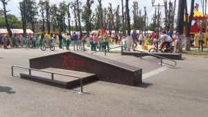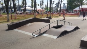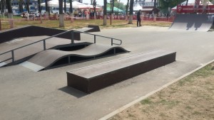 Площадь скейтпарка составляет 400 кв.м и на ней, специальным образом расположены девять фигур: две классические “разгонки” с торцов — радиусная и прямая, между которыми расположен модульный фанбокс с двусторонними наклонными рейлами и бортами, к которым присоединены “дабл-вейв” с одной стороны и оригинальный мануалбокс с флэт-рейлом — с другой.
