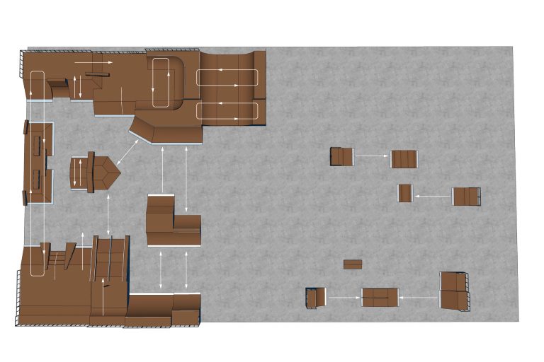 В зоне для начинающих райдеров площадью 355 кв. м., размещены основные фигуры, необходимые для отработки базовых трюков. Квотерпайп позволяет набирать разгон, разворачиваться, выполнять прыжковые трюки в воздухе. Два бэнка также будут полезны при разгоне, развороте, а разница в высоте позволит тренировать трансферные трюки из одного бэнка в другой. Ступенчатый граиндбокс удобен для отработки скольжений и позволяет выбирать высоту в зависимости от уровня райдера. Фанбокс с рейлом, необходимый для обучения новичков, поможет изучить прыжковые трюки, скольжения по периле, а также скольжения после длинного пролёта – «Дизастр». Прямой рейл в этой зоне незаменим во время учения скольжений для райдеров любого уровня.