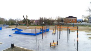 Воркаут-зона так же была разработана по индивидуальному проекту, на базе одного из типовых решений, площадка занимает 280 кв.м. и состоит из нескольких секций - рукоход, турник-квадрат, перекладина и шведская лестница, секция из трех перекладин разноуровневая, скамья для пресса, брусья крестовые овальные, брусья низкие и брусья американские.