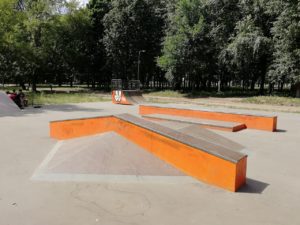 Скейтборд площадка включает в себе такие фигуры как скейтплаза, имитирующая городскую среду и препятствия, также различные конфигурации фан-боксов для прыжков, скольжений и трансферных трюков.