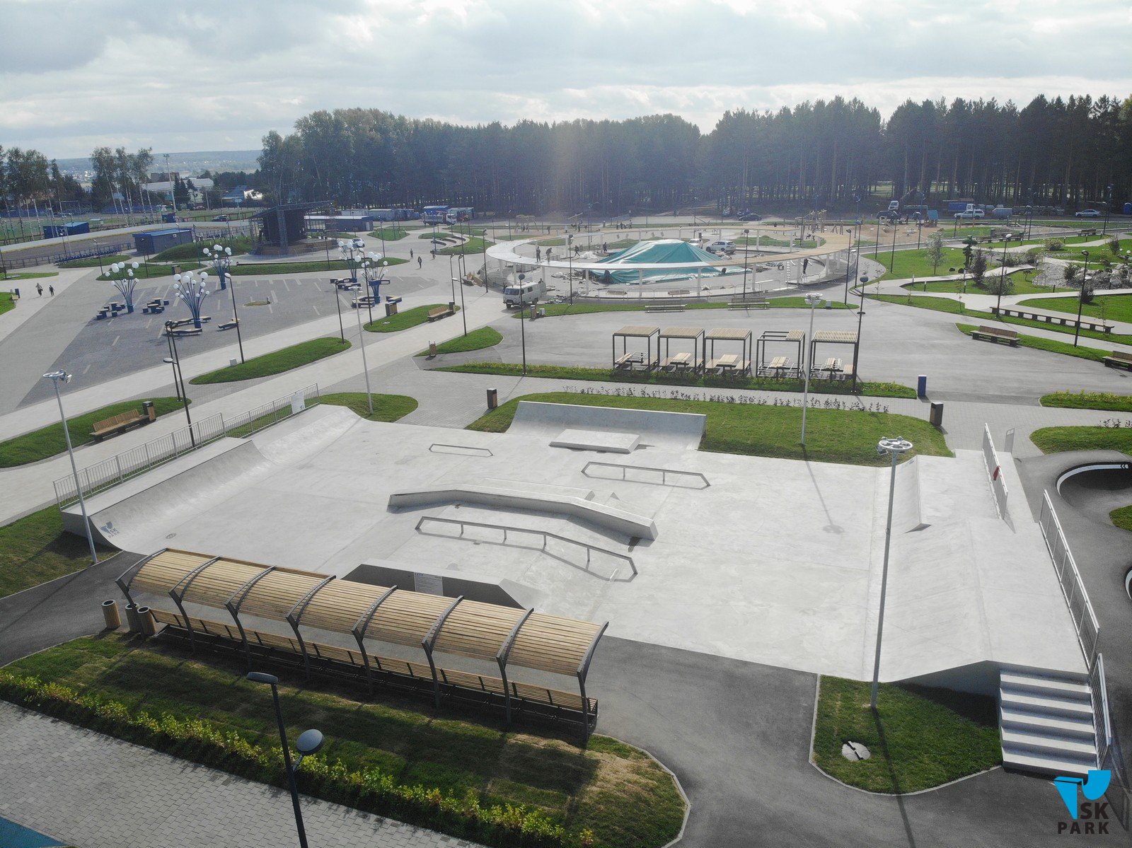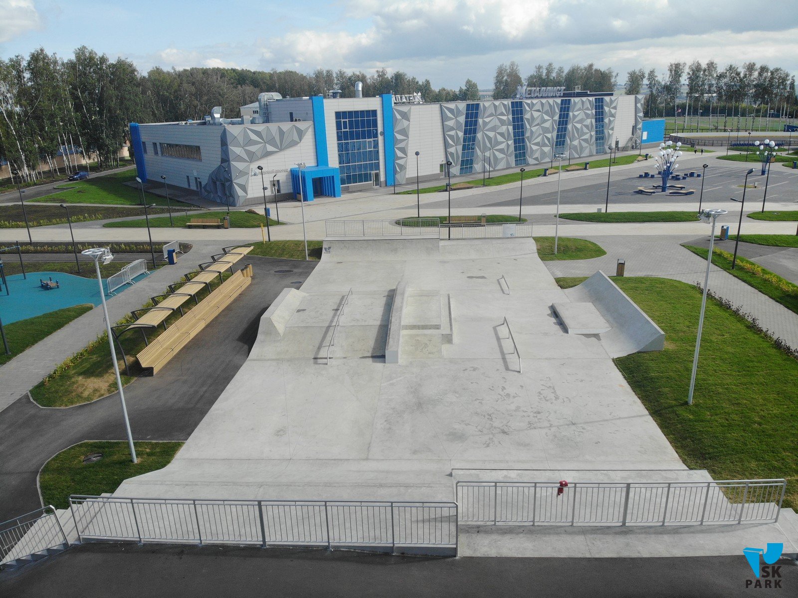 Бетонный скейт парк (650 кв.м) рассчитан на любой уровень подготовки и подходит для тренировок в дисциплинах ВМХ, ролики, кик-скутер и скейтбординг, в том числе и для олимпийской дисциплины Скейтбординг "Стрит".