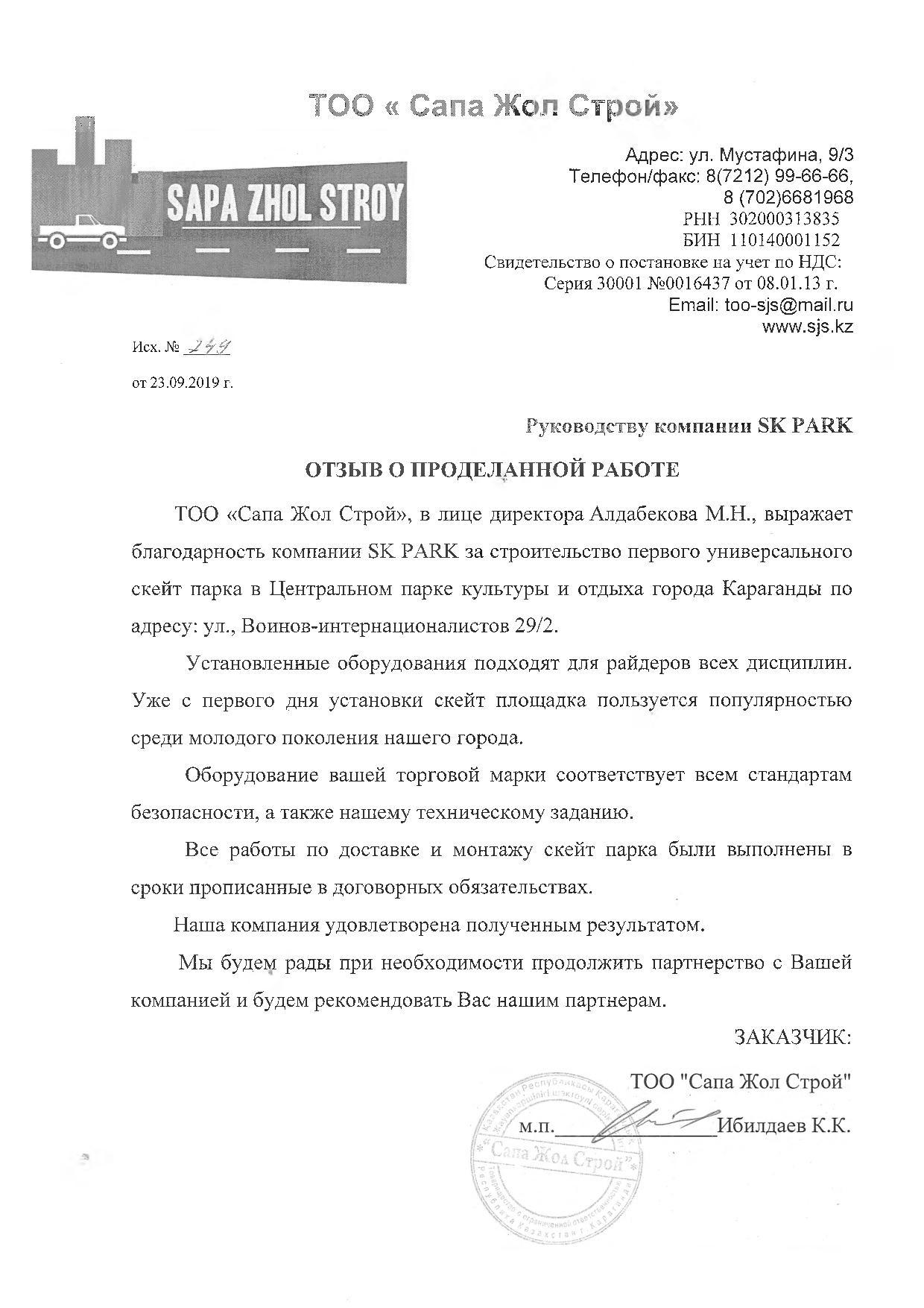 20 июня 2019 года, в Караганде (Казахстан) был введен в эксплуатацию скейт парк от компании SKPARK. Площадка построенная по типовому проекту SK 41-19, представляет собой готовое решение из нашего каталога, ее площадь составляет 780 кв. м., вмещая 25 райдеров одновременно.